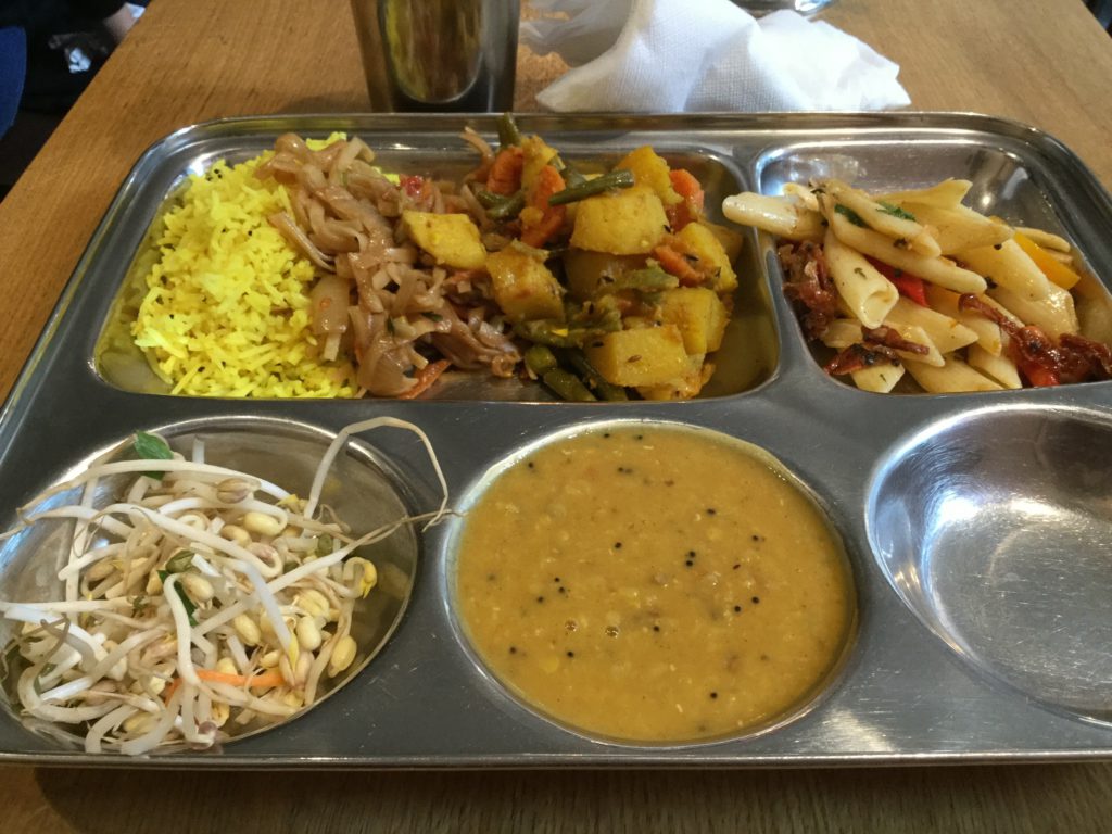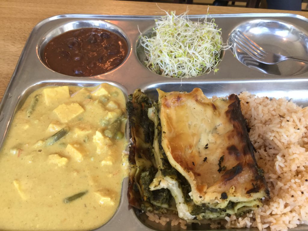 There's always several types of rice, noodles, vegetables. There are also always several types of sauces, very tasty. Another very cool thing - sprouts, basically free (since they weigh almost nothing). For an extra charge you can get soup (I've almost never tried it, there was enough already) and Indian pastries (very cool, but more expensive).