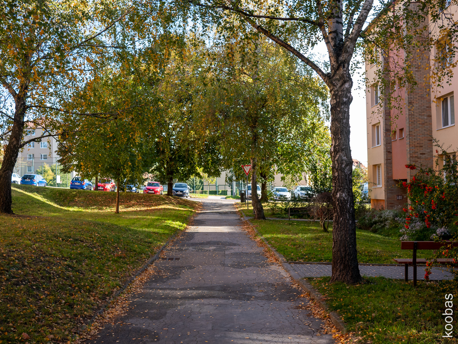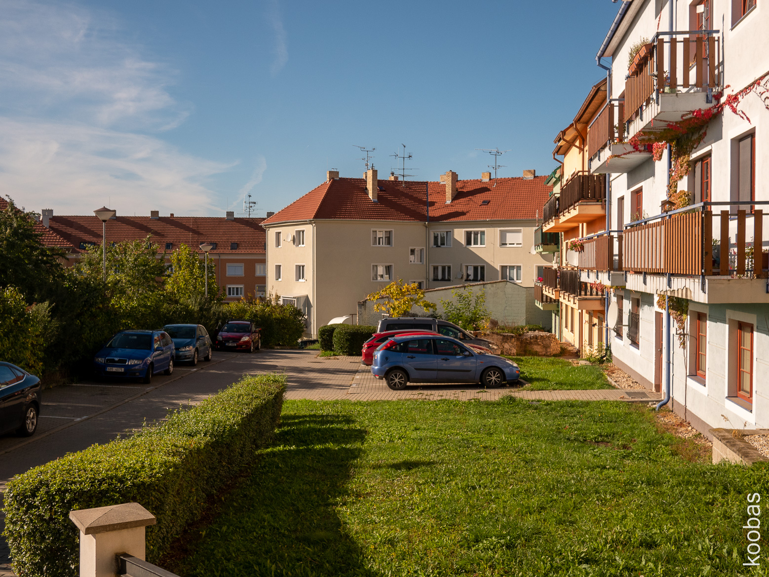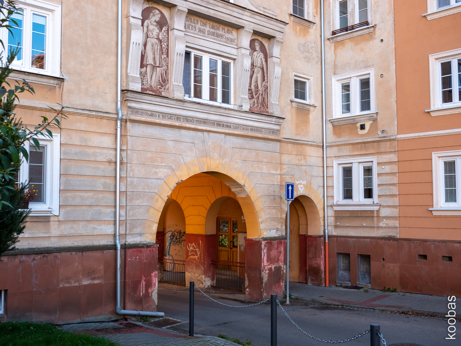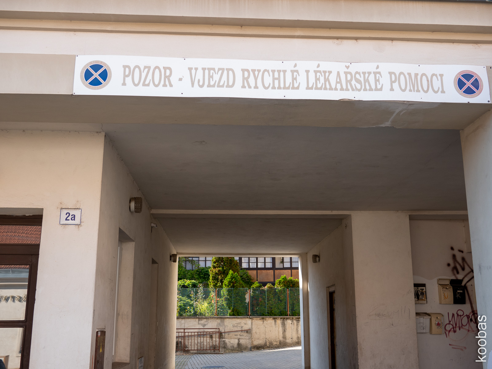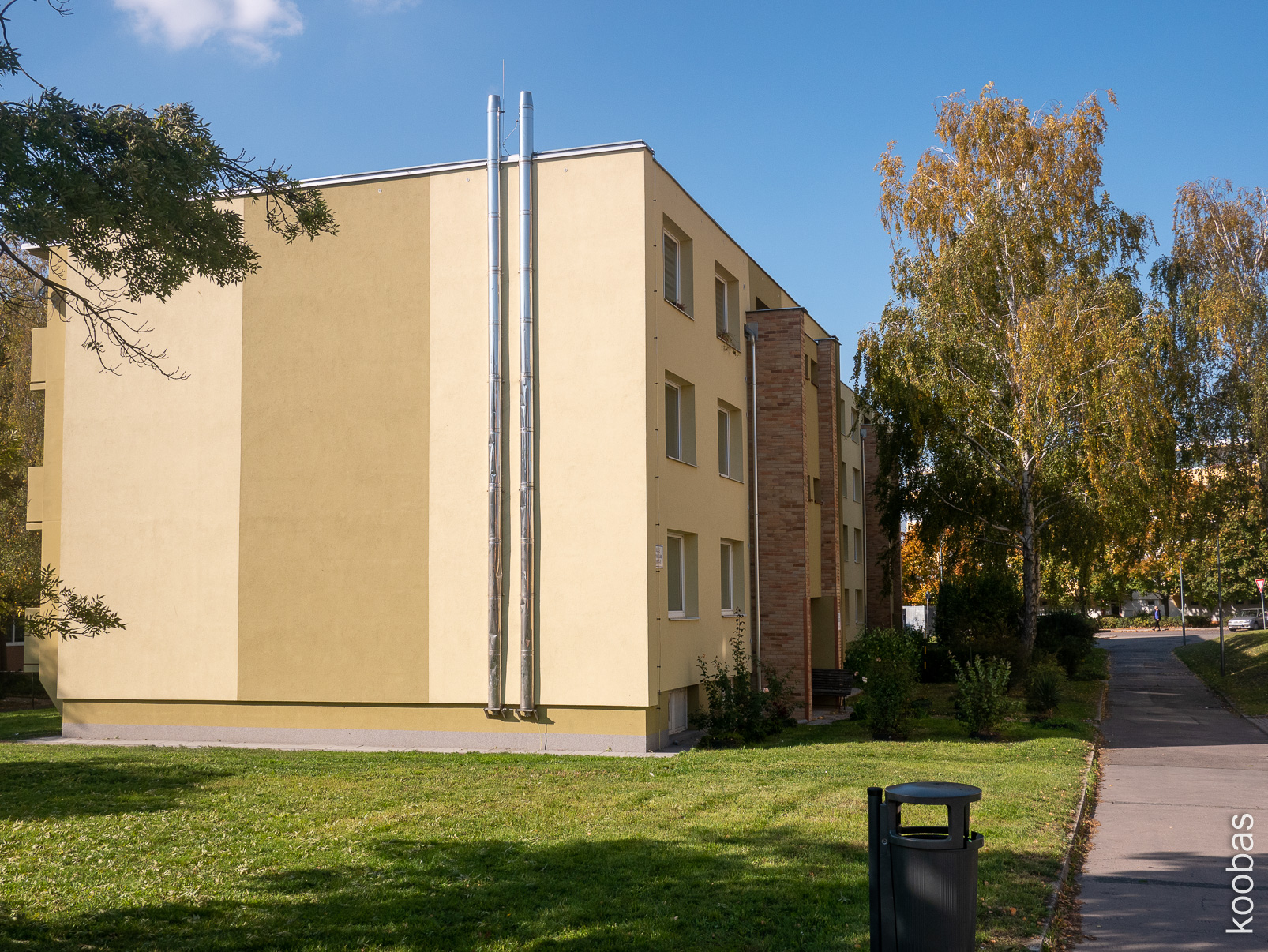 Courtyard in a panel building, my grandma had the same, benches at the entrance are present