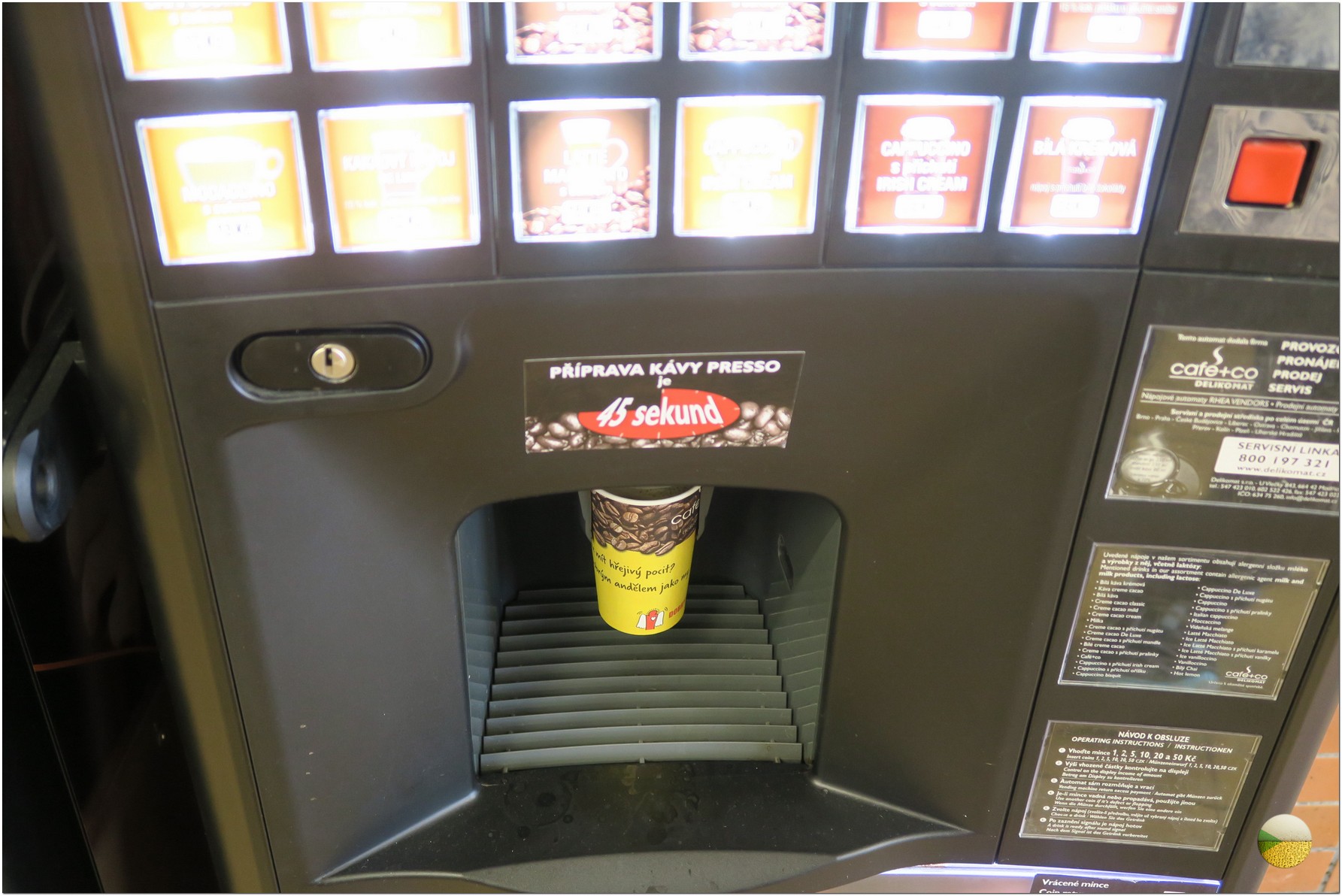 Decided to drink coffee, my favorite, time-tested. By the way, its price in different vending machines is different: for example, in NTK library - 20 crowns, at my university - 22, and here - 24. What was funny is that for the meticulous they wrote how long the coffee will take to make. All lies, turned out faster :)