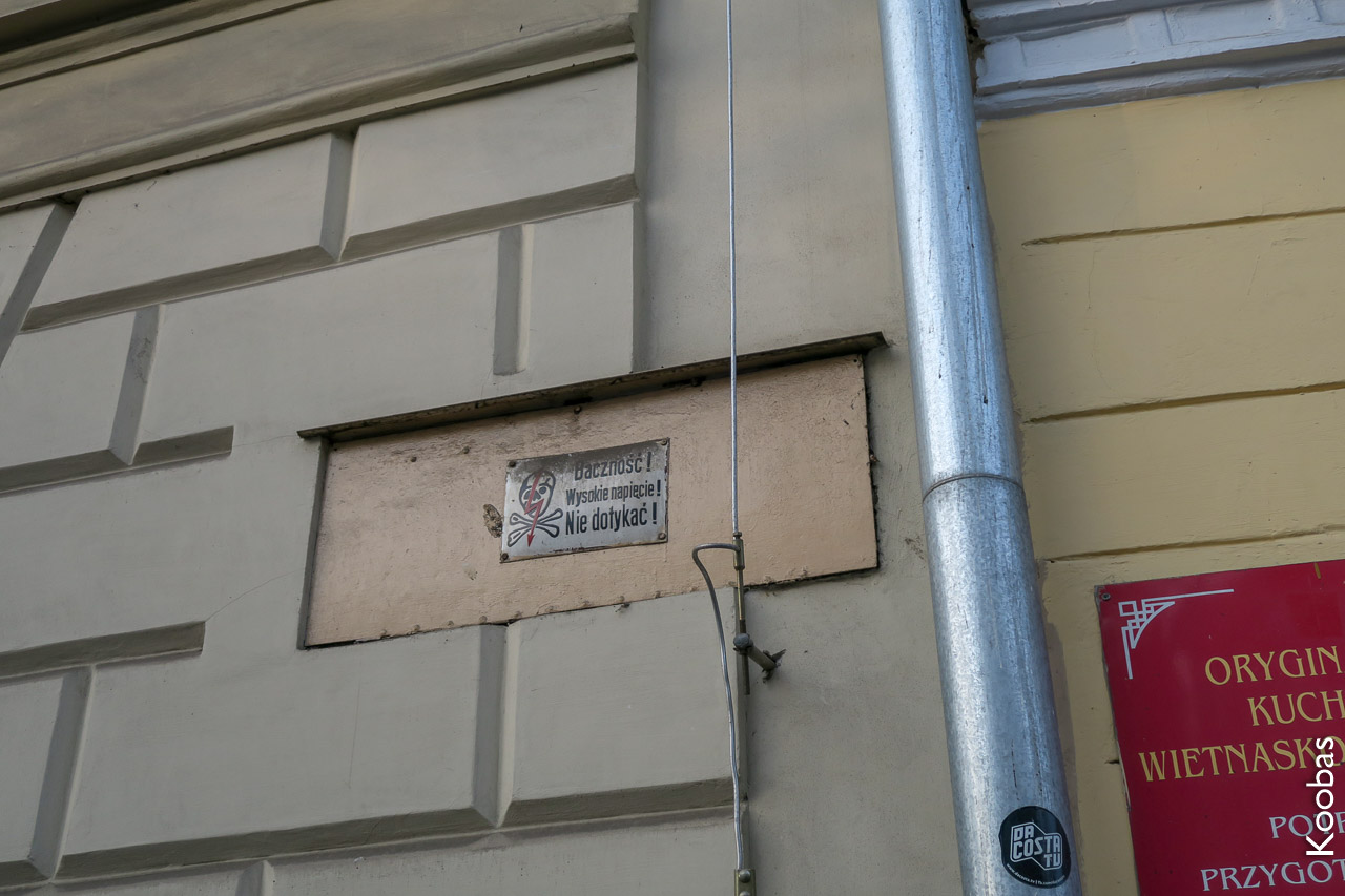Signs, wires and Krakow in the background